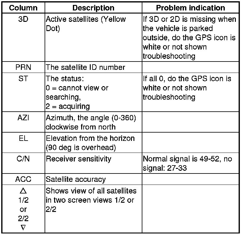 - If the row of data in the table below begins with a yellow dot, the AZI and EL fields can be used to locate each satellite on the circular GPS diagram (see prior screen).