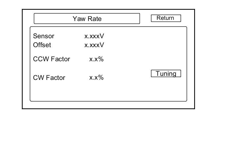 2. Road test: Drive the vehicle on a very straight road. Enter the diagnostic mode, select Yaw rate, and touch the Tuning button. While driving down a straight road, the white dots should trace a straight line across the screen. However, if you are driving on a straight road, and you notice the dots constantly dropping down or heading up as you drive, the navigation unit's yaw sensor is defective. You can touch Reset to clear ANG-Disp, and dotted lines.