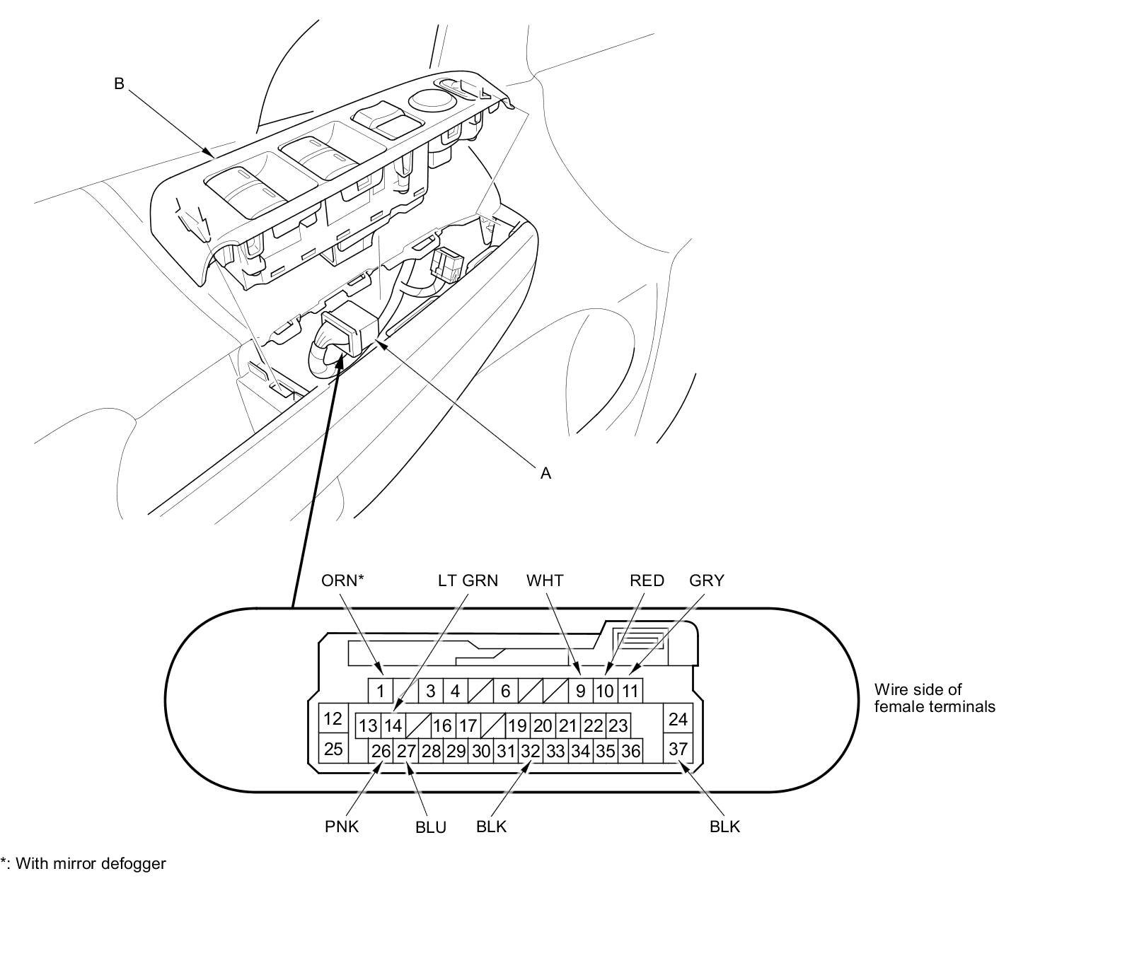 3. Disconnect the 37P connector (A) from the power window master switch (B).