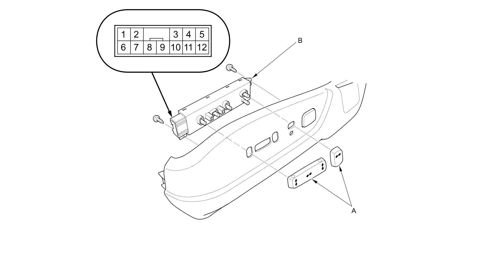 3. Remove the two screws and the power seat adjustment switch (B).
