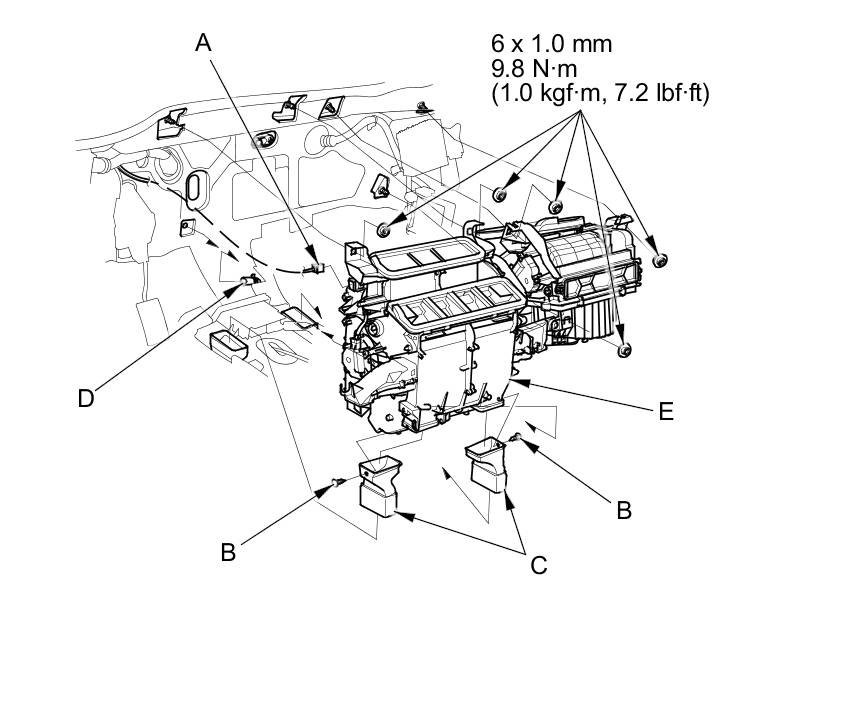 8. Disconnect the connector (A). Detach the clips (B), remove the ducts (C) and the drain hose (D). Then remove the mounting bolt, the mounting nuts, and the blower-heater unit (E).