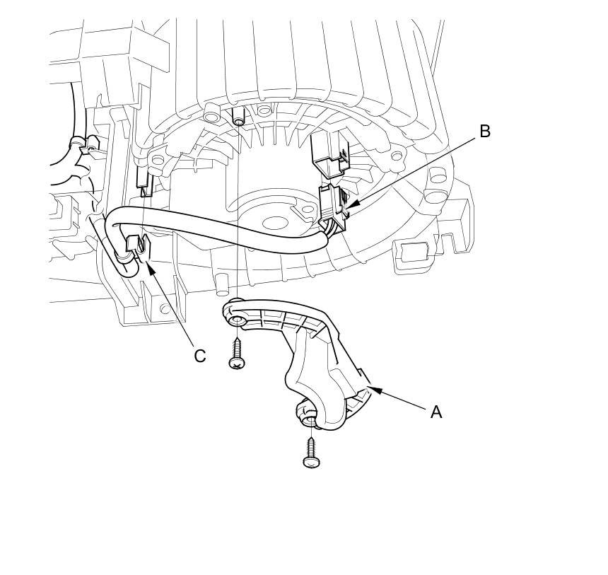 10. Disconnect the connector (B) from the blower motor. Detach the harness clip (C).