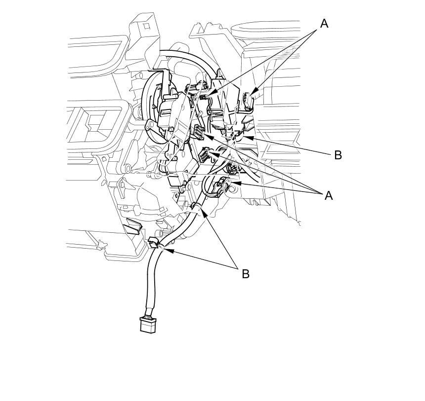 11. Disconnect these connectors (A): The mode control motor, the power transistor, the evaporator temperature sensor, the passenger's air mix control motor (with climate control), and the recirculation control motor. Detach the harness clips (B).