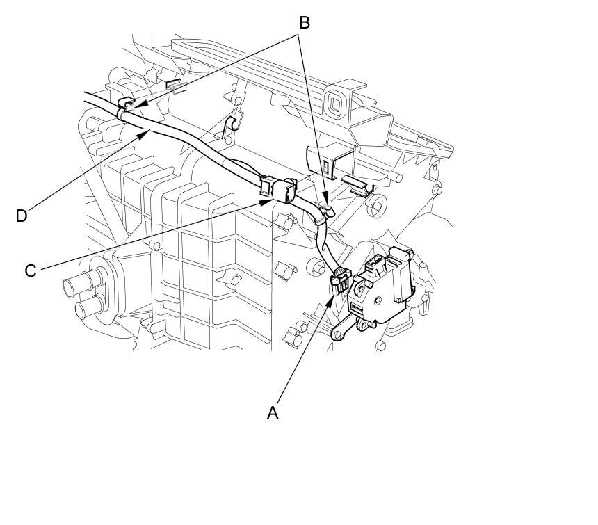 12. Disconnect the connector (A) from the air mix control motor. Detach the harness clips (B), and the connector clip (C), and remove the wire harness (D).