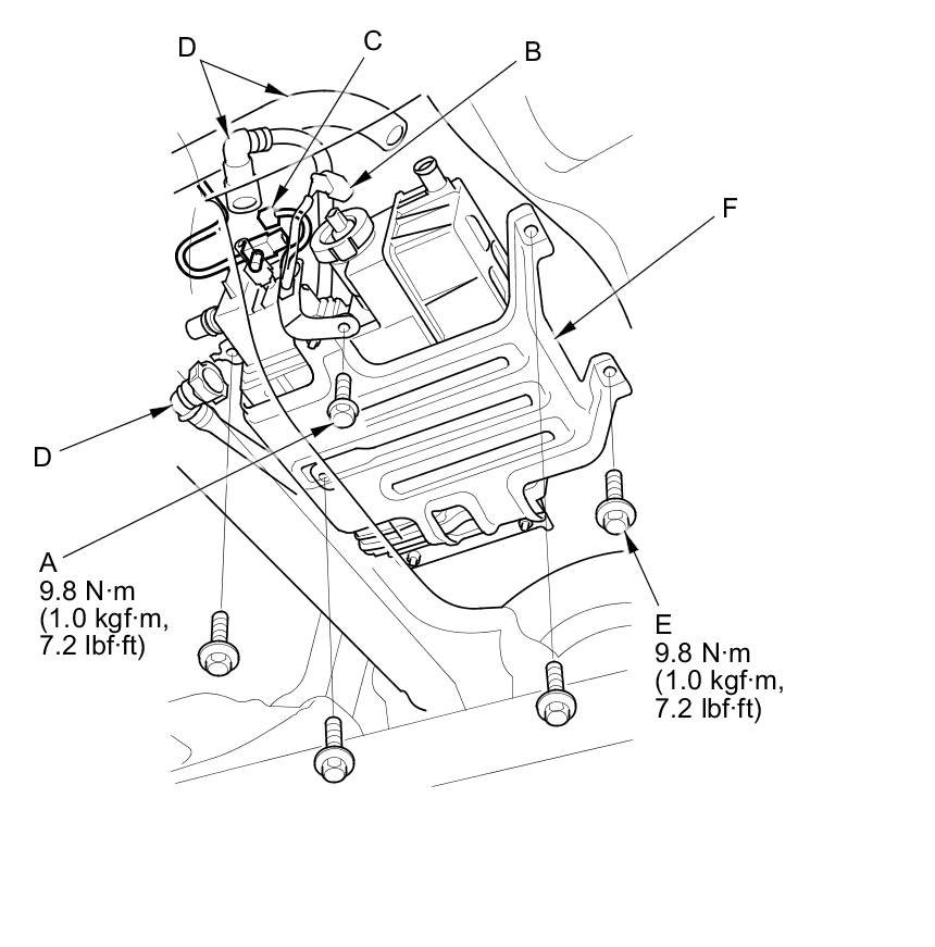 2. Remove the bolts (E), and move the EVAP canister assembly (F) to the rear.