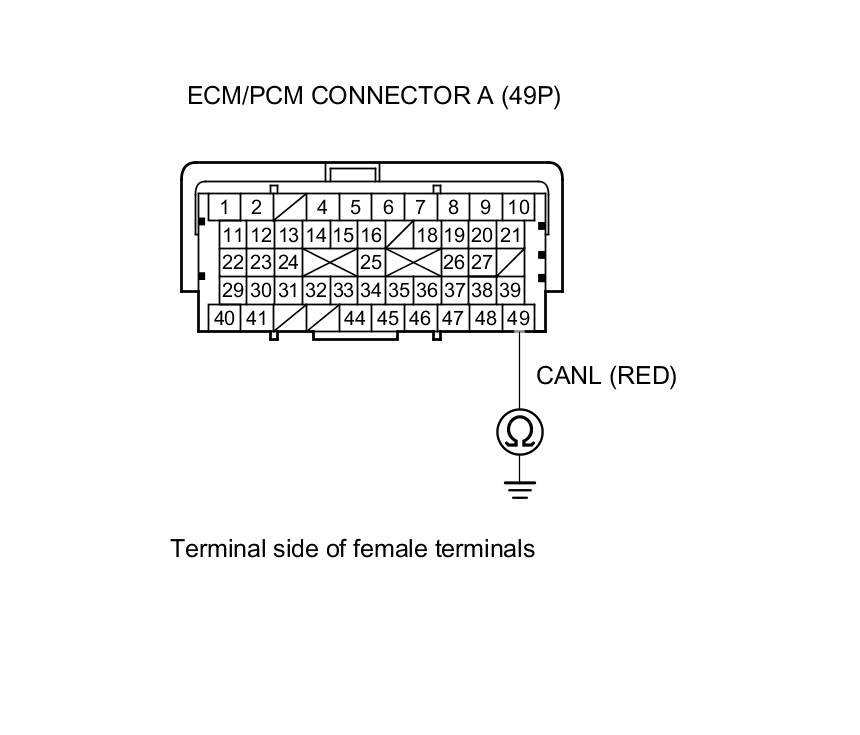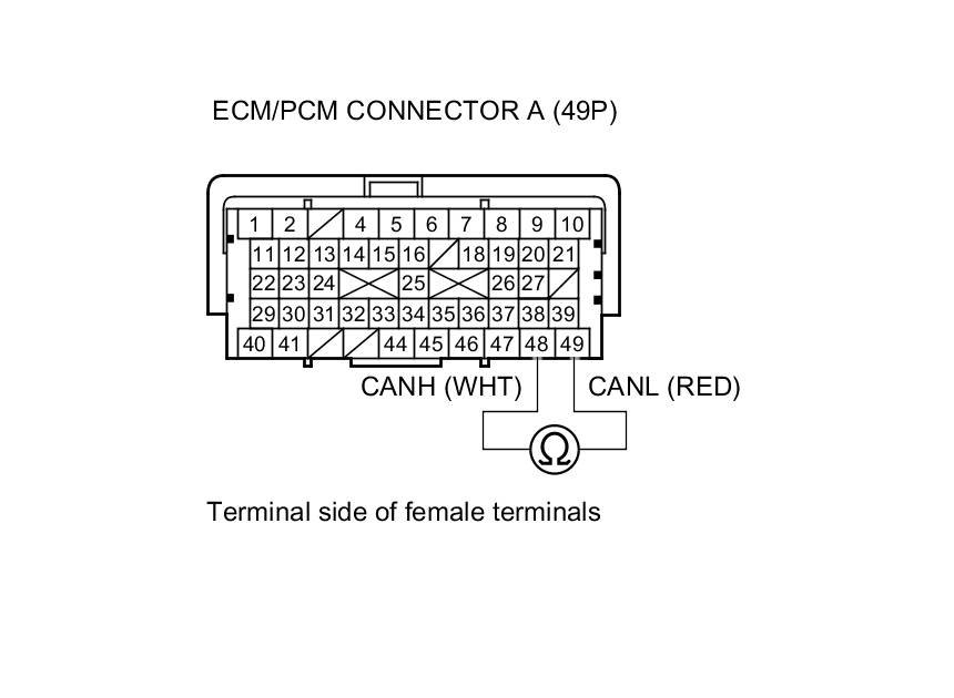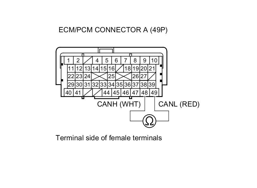 4. Measure the resistance between ECM/PCM connector terminals A48 and A49.