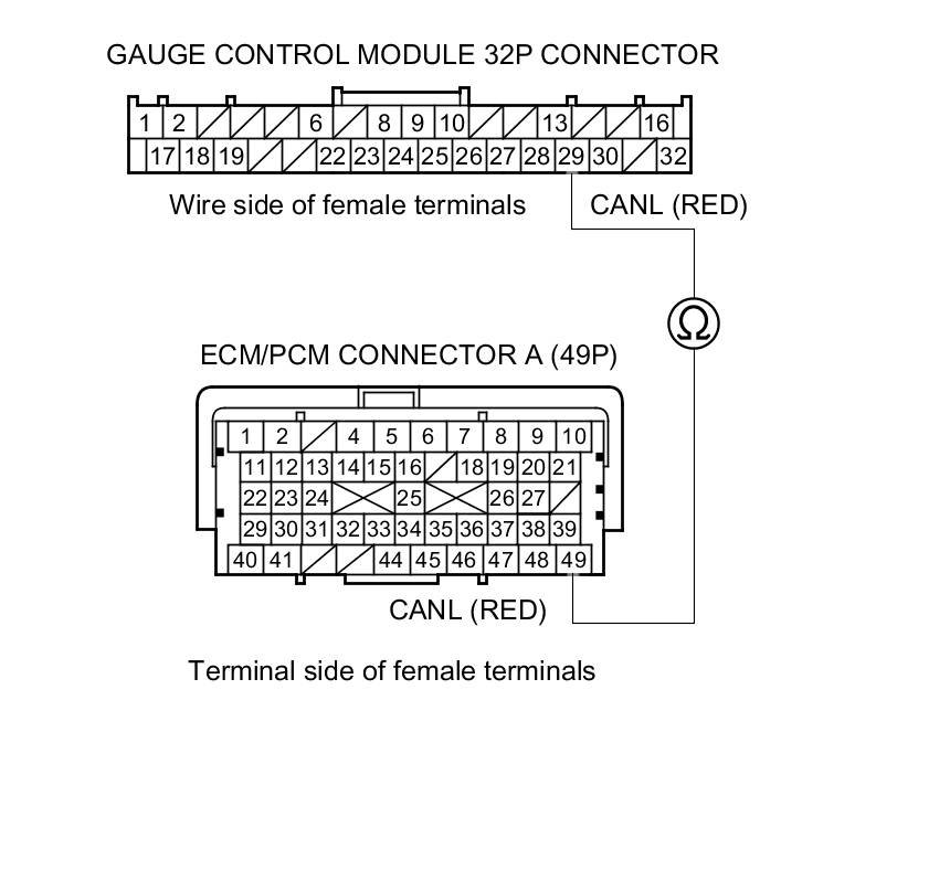 10. Check for continuity between ECM/PCM connector terminal A49 and gauge control module 32P connector terminal No. 29.