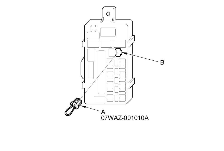 4. Connect the MPCS service connector (A) to the MICU service check connector socket (B) in the driver's under-dash fuse/relay box.