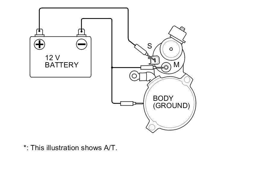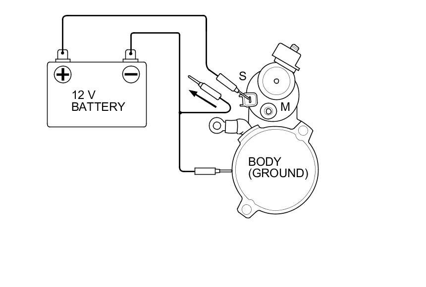 5. Connect the battery as shown. Make sure you disconnect the starter motor wire from the M terminal. If the starter pinion moves out, it is working properly.