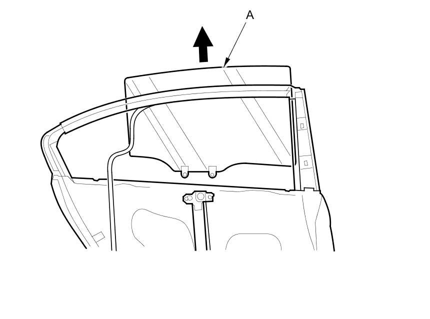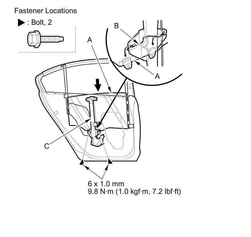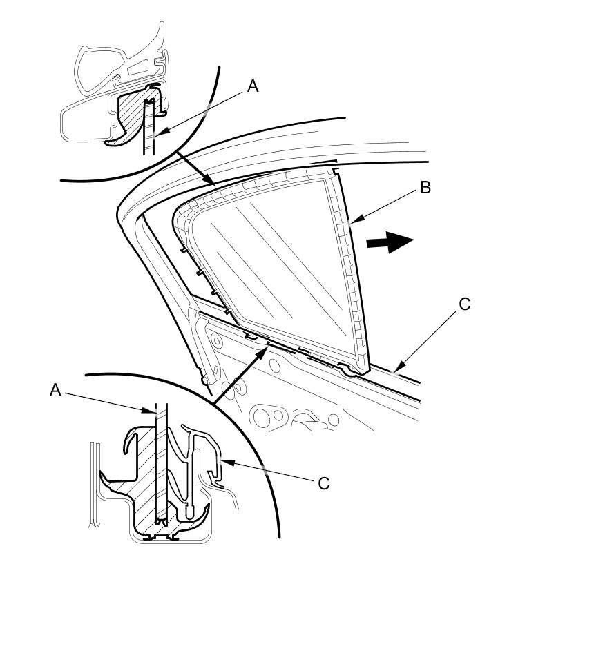 NOTE: Take care not to damage the door glass outer weatherstrip (C).