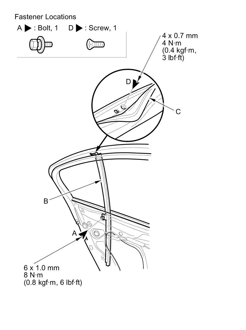 4. Remove the bolt (A) from the rear lower channel (B). Pull away the door weatherstrip (C) as needed, and remove the screw (D).