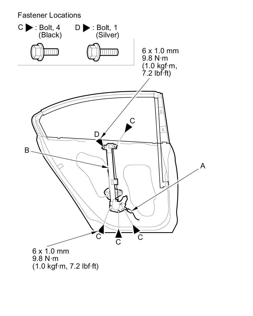 10. Remove the bolts (C), and loosen the bolt (D), then remove the regulator through the hole in the door.