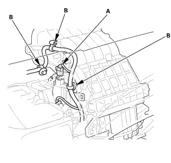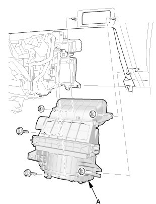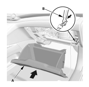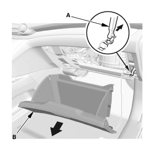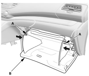 3. Detach the glove box damper hook (A), then remove the glove box (B).