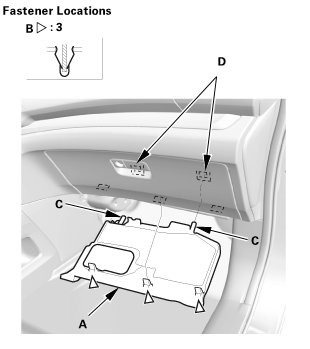 1. Install the passenger's dashboard undercover (A). Make sure the clips (B) snap into place securely, and the pins (C) into the holder (D) securely.