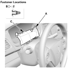 1. Carefully pry out the dashboard meter visor blind cover (A) with the appropriate trim tool to detach the clips (B) and the hook (C), then tuck up the dashboard meter visor blind cover.