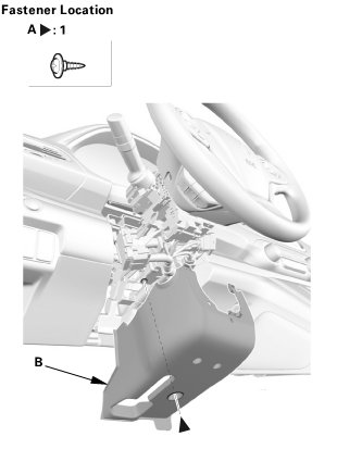 1. Turn the steering wheel to the left. Remove the screw (A) securing the lower column cover (B) from the front side.