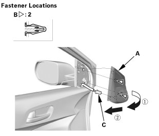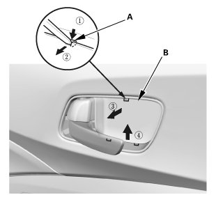 1. Carefully pry out the door mirror cover (A) with the appropriate trim tool to detach the clips (B), then remove the door mirror cover.