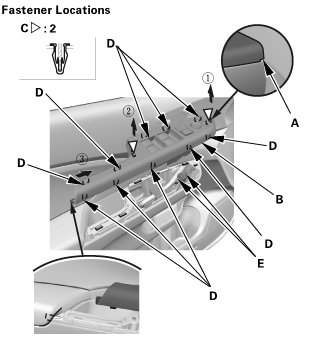 1. Carefully pry out on the notch (A) in the power window switch panel (B) with the appropriate trim tool to detach the clips (C) and the hooks (D). Disconnect the connectors (E), then remove the power window switch panel.