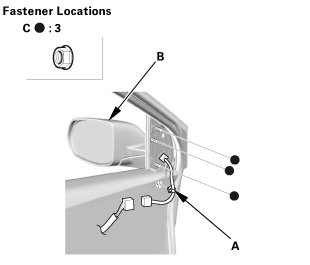 2. Install the door mirror cover (B). Make sure the clips (C) snap into place securely.