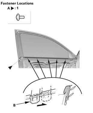 2. Slide the front door glass outer weatherstrip clips (B) forward to release it from the door.