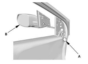 1. Insert the harness (A) into the hole in the door, then install the power mirror (B).