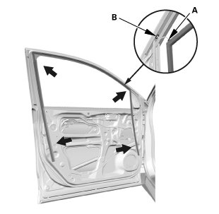 1. Align the notch (A) of the glass run channel with the alignment mark (B) on the body, then install the run channel all the way around.