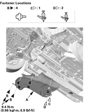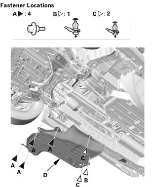 1. Remove the bolts (A) and the clips (B, C) securing the front floor undercover (D), then remove the front floor undercover.