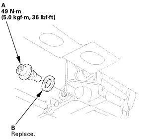 2. Reinstall the drain plug using a new sealing washer (B).