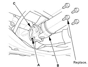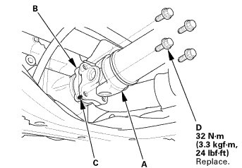 1. Set the No. 1 propeller shaft (A) to the transfer companion flange (B) by aligning the reference mark (C) you made during the removal procedure. Then install new flange bolts (D) to the specified torque.