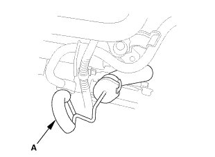 6. If necessary, fill the transmission with ATF through the dipstick guide tube opening (A) to bring the fluid level between the upper mark and the lower mark of the dipstick. Do not fill the fluid above the upper mark. Always use ATF DW-1 (genuine Honda automatic transmission fluid). Using a non-Honda ATF can affect shift quality.