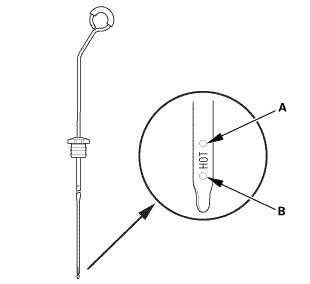 3. Remove the dipstick, and check the ATF level. It should be between the upper mark (A) and the lower mark (B).