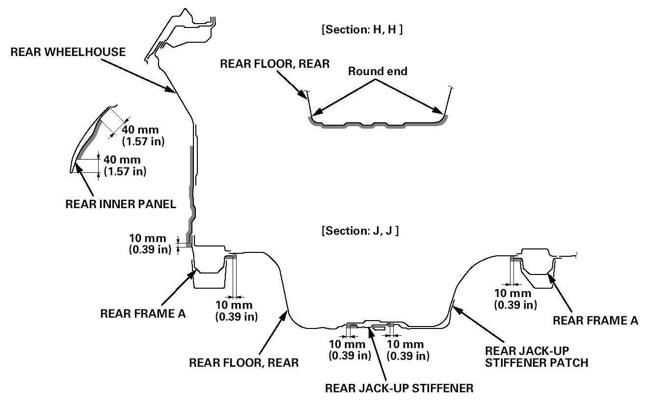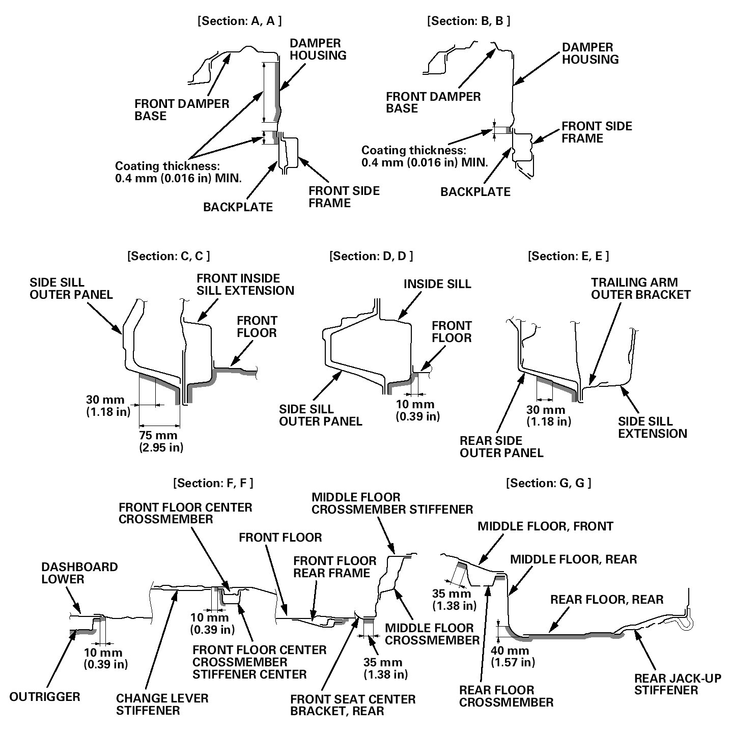- Front wheelhouse, rear wheelhouse, and dashboard lower coating thickness 0.5 mm (0.020 in).