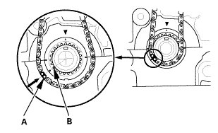 1. Install the cam chain on the crankshaft sprocket with the colored piece (A) aligned with the mark (B) on the crankshaft sprocket.