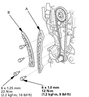 3. Install the cam chain guide (A) and the cam chain tensioner arm (B).