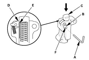 1. Compress the cam chain auto-tensioner when replacing the cam chain. Remove the pin (A) from the auto-tensioner that was installed during removal. Turn the plate (B) counterclockwise, to release the lock, then press the rod (C), and set the first cam (D) to the first edge of the rack (E). Insert the 1.0 mm (1/32 in) diameter pin back into the holes (F).
