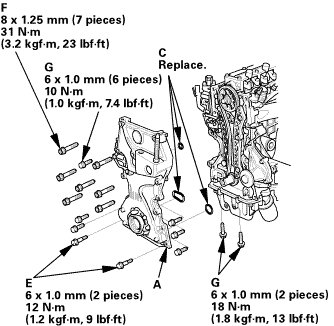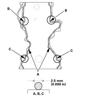 * Apply a 5 mm (0.20 in) diameter bead of liquid gasket to the mating surfaces (C).