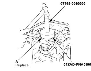 2. Use the driver handle and the oil seal driver attachment, 96 mm to drive a new crankshaft oil seal (A) squarely into the engine block to the specified installed height.