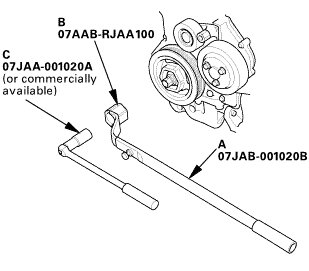 7. Hold the pulley with the holder handle (A) and crankshaft pulley holder (B), then torque the bolt to 70 Nm (7.1 kgfm, 52 lbfft) with a torque wrench and a socket (C).