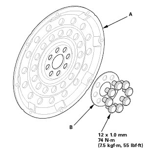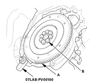 1. Install the drive plate (A) and the washer (B), and tighten the eight bolts in a crisscross pattern in at least two steps.