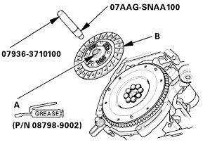 1. Temporarily install the clutch disc onto the splines of the transmission mainshaft. Make sure the clutch disc slides freely on the mainshaft.
