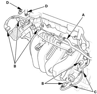 1. Install the intake manifold and throttle body assembly (A) with new gaskets (B).