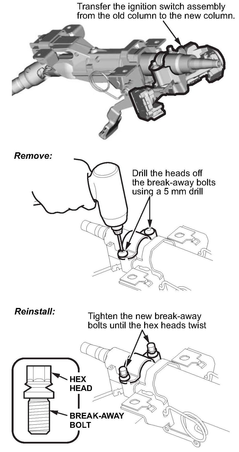 3. Transfer the ignition switch assembly to the new steering column using new break-away bolts.