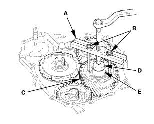 12. Set a spacer (D) between the puller and the idler gear shaft (E).