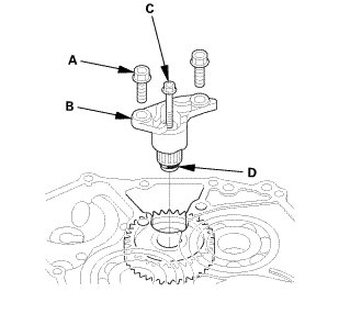 2. Install a 5 x 0.8 mm bolt (C) in the reverse gear shaft, and pull it to remove the reverse idler gear shaft (D) and the reverse idler gear shaft holder together.