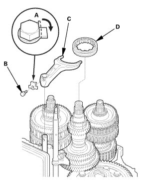 3. Remove the reverse shift fork (C) with the reverse selector (D) together.