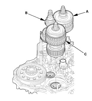 1. Remove the mainshaft subassembly (A), the countershaft subassembly (B), and the secondary shaft subassembly (C) together.