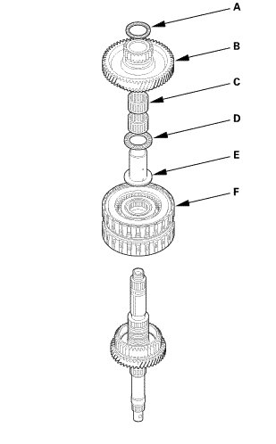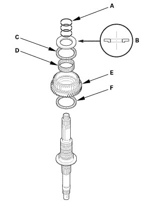 1. Remove the thrust needle bearing (A), 5th/reverse gear (B), the needle bearings (C), the thrust needle bearing (D), the 5th gear collar (E), and the 3rd/5th clutch (F).