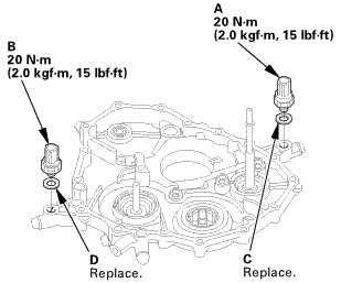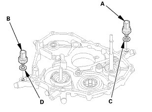 2. Remove transmission fluid pressure switch B (3rd clutch) with the sealing washer (D).