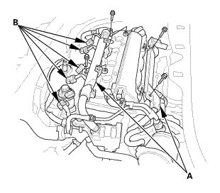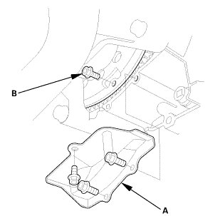 2. Remove the torque converter bolts (B) (8 bolts) while rotating the crankshaft pulley.