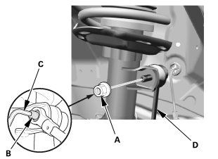 2. Hold the lower slide shaft (A) on the column with a piece of wire (B) between the joint yoke (C) of the lower slide shaft and the joint yoke (D) of the upper shaft to prevent the lower slider shaft from pulling out.